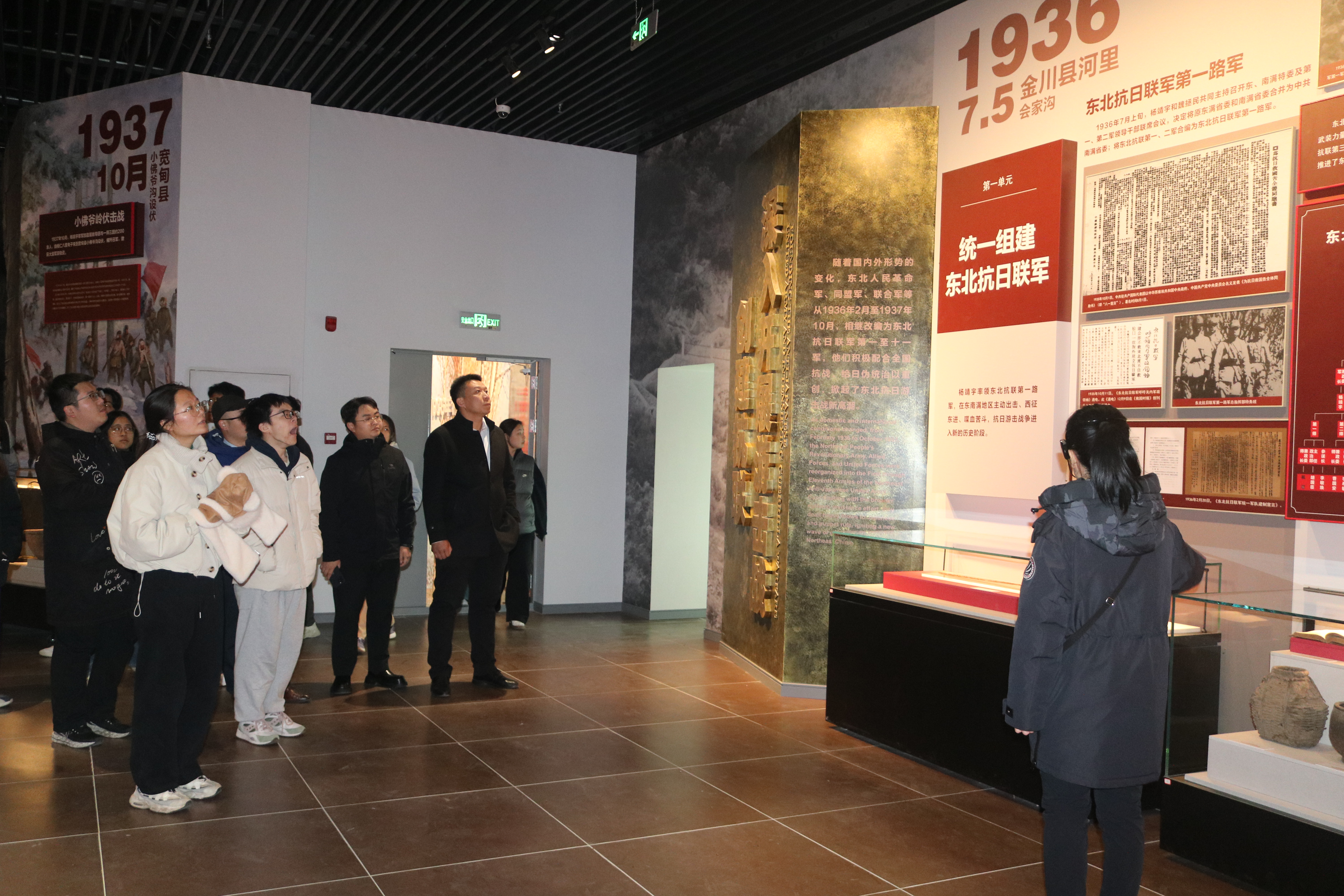 当日下午,参训师生前往靖宇县杨靖宇将军纪念馆,透过馆内详实的历史资料与丰富的文物展示,深入了解到杨靖宇将军的人生轨迹,从1905年生于河南确山县,到1927年加入中国共产党、1929年赴东北开展革命工作,再到1936年组建东北抗联第一路军、1940年壮烈殉国,每一段历程都让学员们深受震撼。纪念馆内6组山形雕塑串联起中国抗战14年历史,顶部红色光束隐喻不朽的抗联精神,进一步加深了学员对“忠贞报国、勇赴国难”抗联精神的理解与认同。