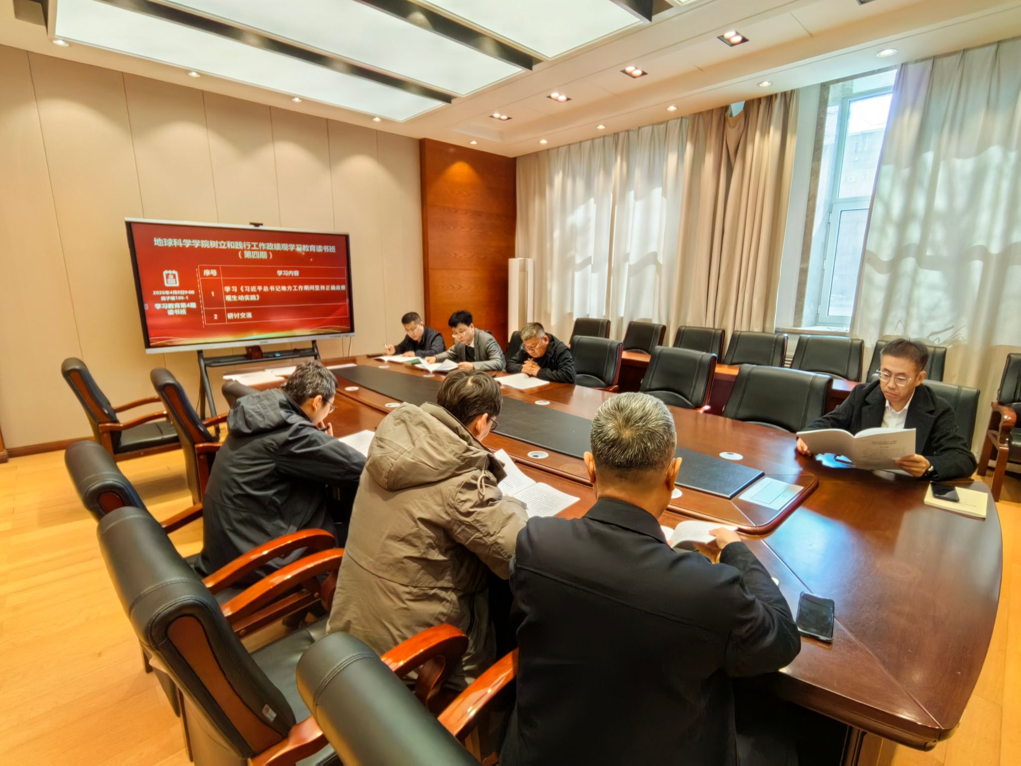 4月8日上午,地球科学学院在鸽子楼109-1会议室举办树立和践行正确政绩观学习教育读书班(第四期),学院领导班子成员参加会议。会议由党委书记衣长涛主持。